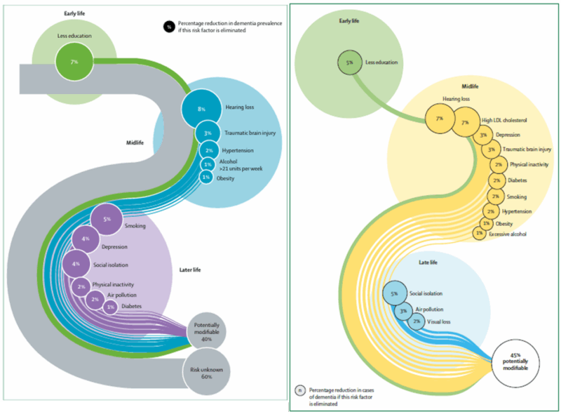 中年期 (18-65歳) | 難聴 8% 頭部外傷 3% 高血圧 2% アルコール多飲 1% 肥満 1% | 難聴 7% LDLコレステロール 7% うつ病 3% 頭部外傷 3% 運動不足 2% 糖尿病 2% 喫煙 2% 高血圧 2% 肥満 1% アルコール多飲 1% |